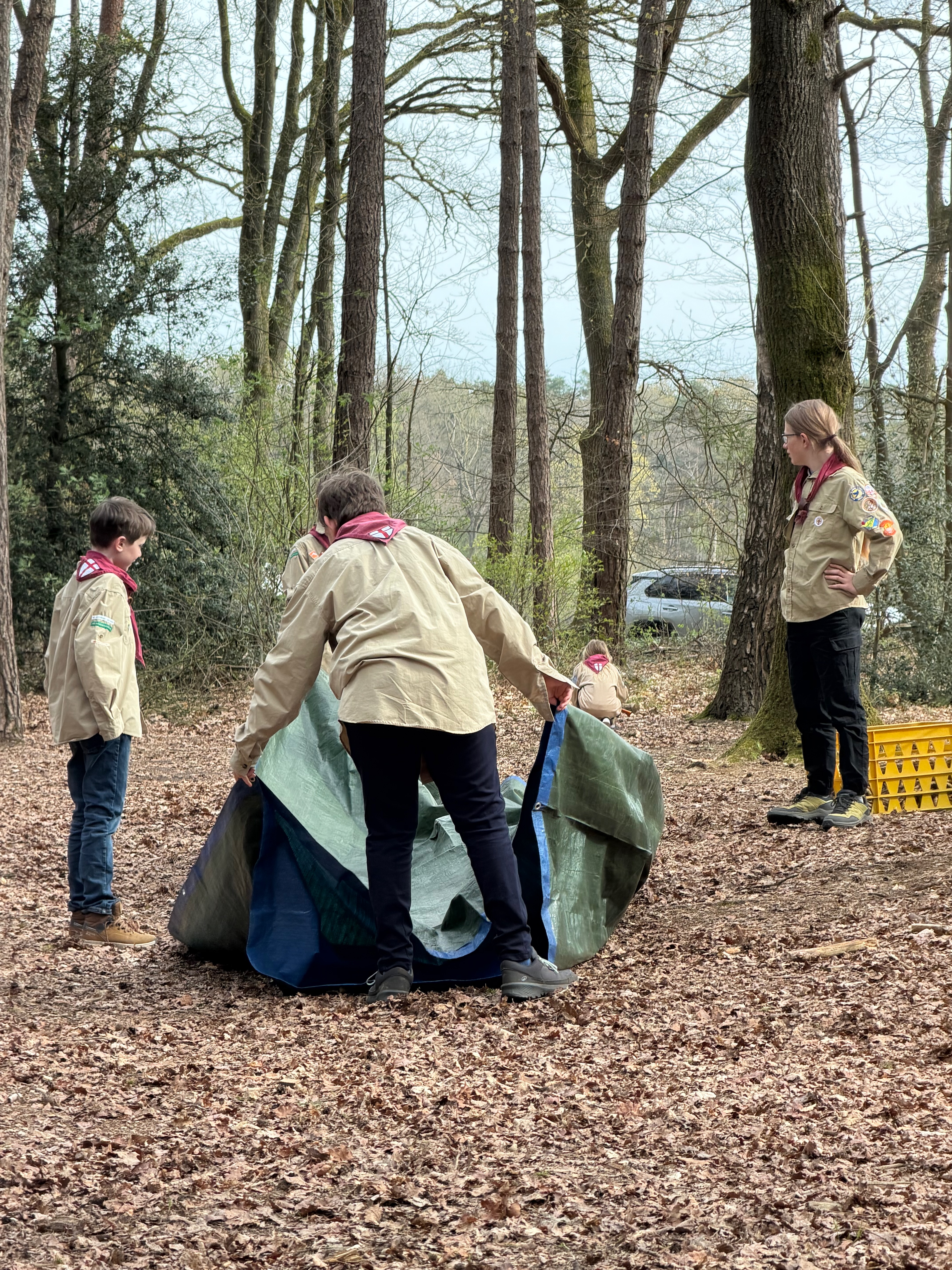 Alle scouts begonnen met het maken van een onderkomen en nadat ze daarmee klaar waren hebben ze van Thijs en Martijn nog enkele tips gekregen voor het verbeteren van hun onderkomen. Sommige scouts hebben er van geleerd dat als je de zijkanten dichtvouwt het nog meer regen en wind scheelt.